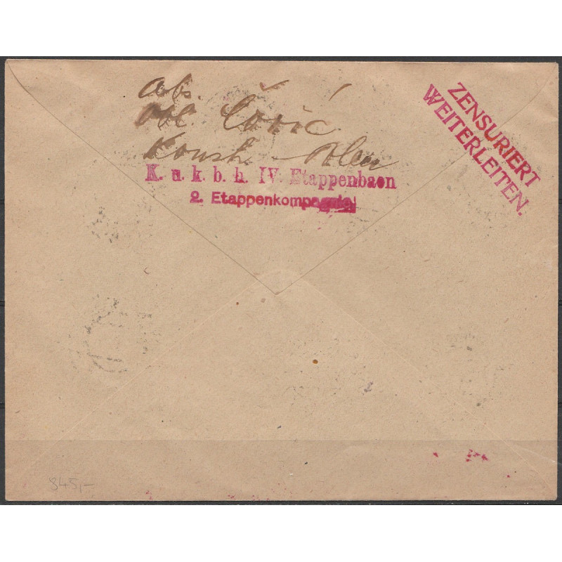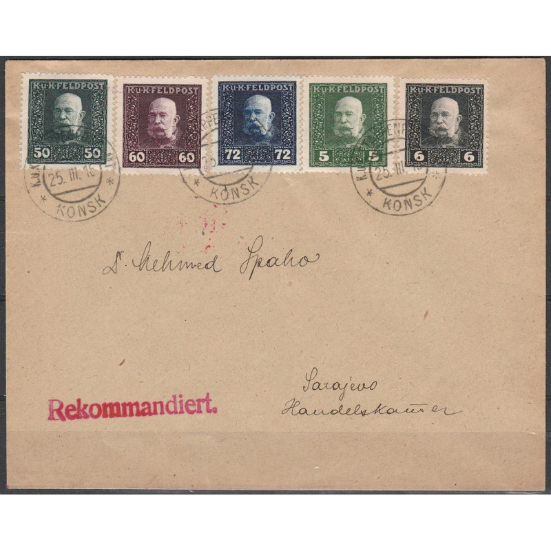 Austro-Hungarian occupation. Cover sent from Konsk. Military stamps with Emperor Franz Josef, Mi 25a, 26, 38, 39 and 40.