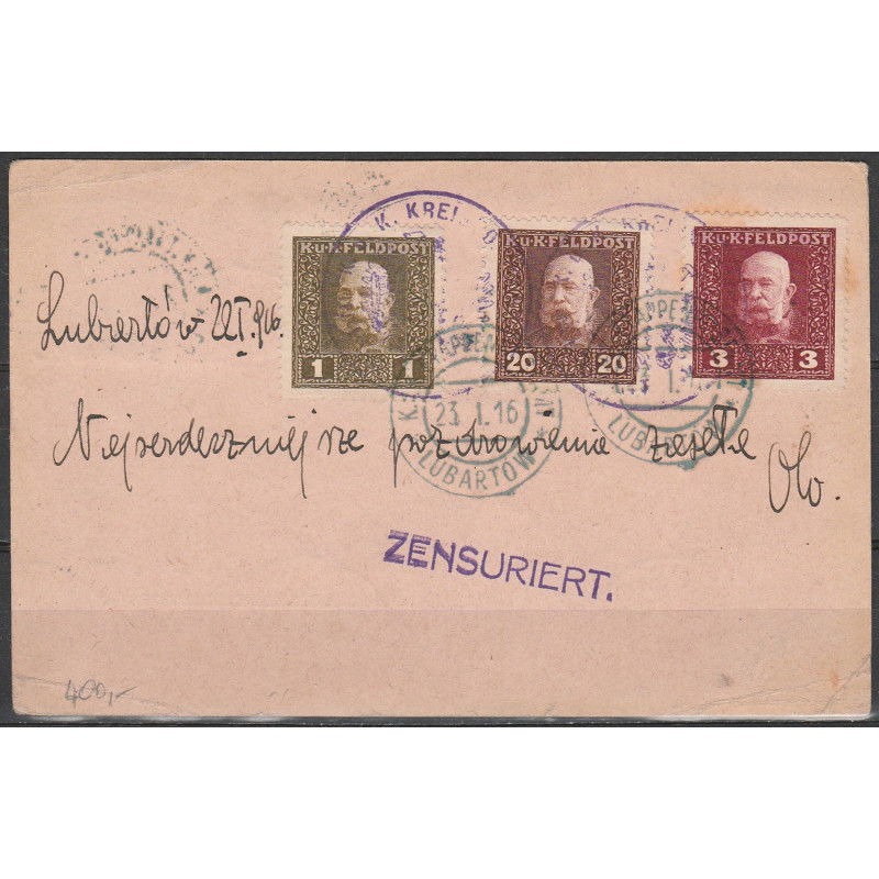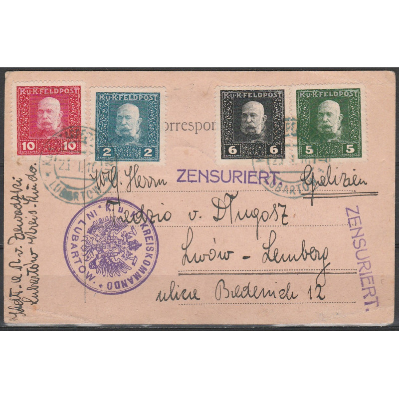 Austro-Hungarian occupation. Postcard sent from Lubartow to Lemberg (Lwow). Military stamps with Emperor Franz Josef, Mi 22, 23, 24, 25a, 26, 27 and 31.