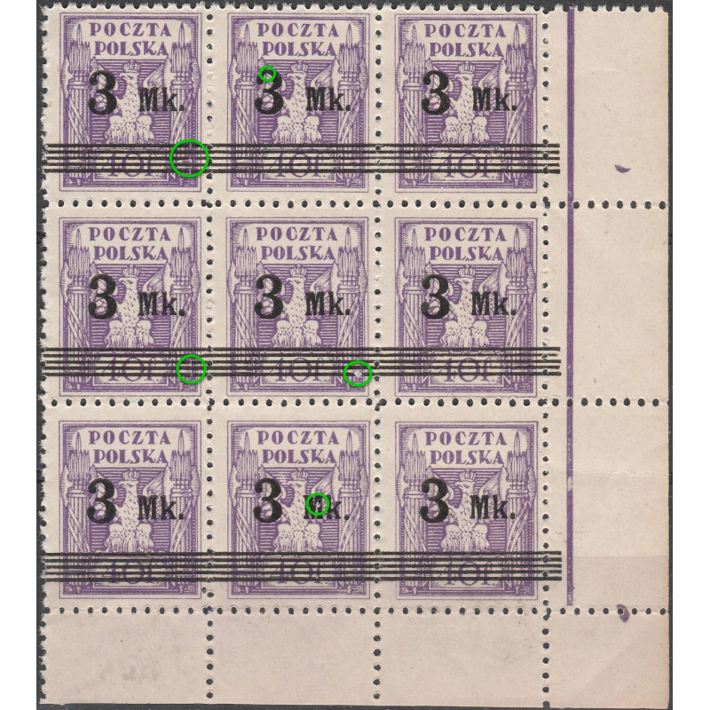 Surcharge issue. Stamps in mint condition, never hinged. Block of 9 with some errors.