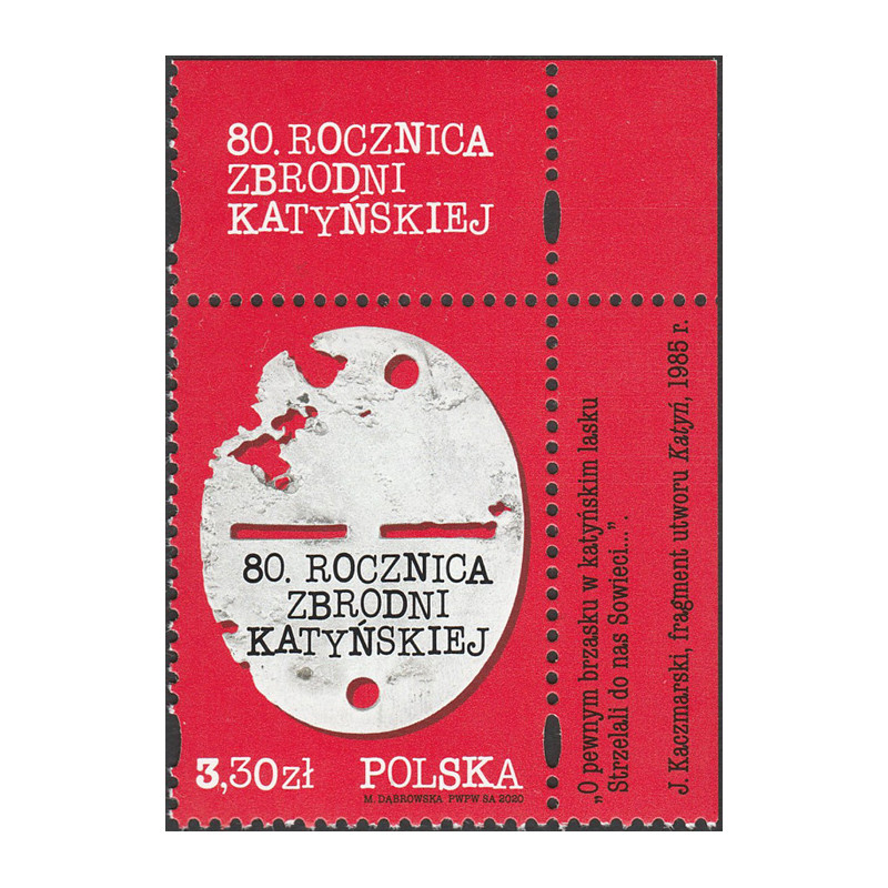 80th anniversary of the Katyń Massacre. Stamp in mint condition, never hinged. Issue name on the margin.