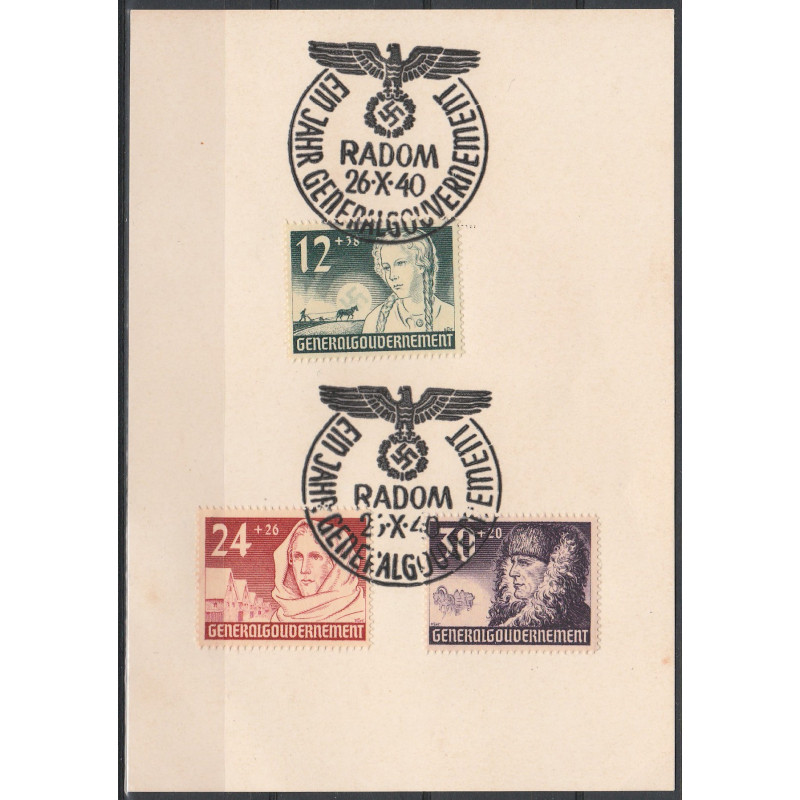 1. rocznica utworzenia Generalnego Gubernatorstwa. Znaczki kasowane okolicznościowo na karcie. Kasownik 6d, Radom.