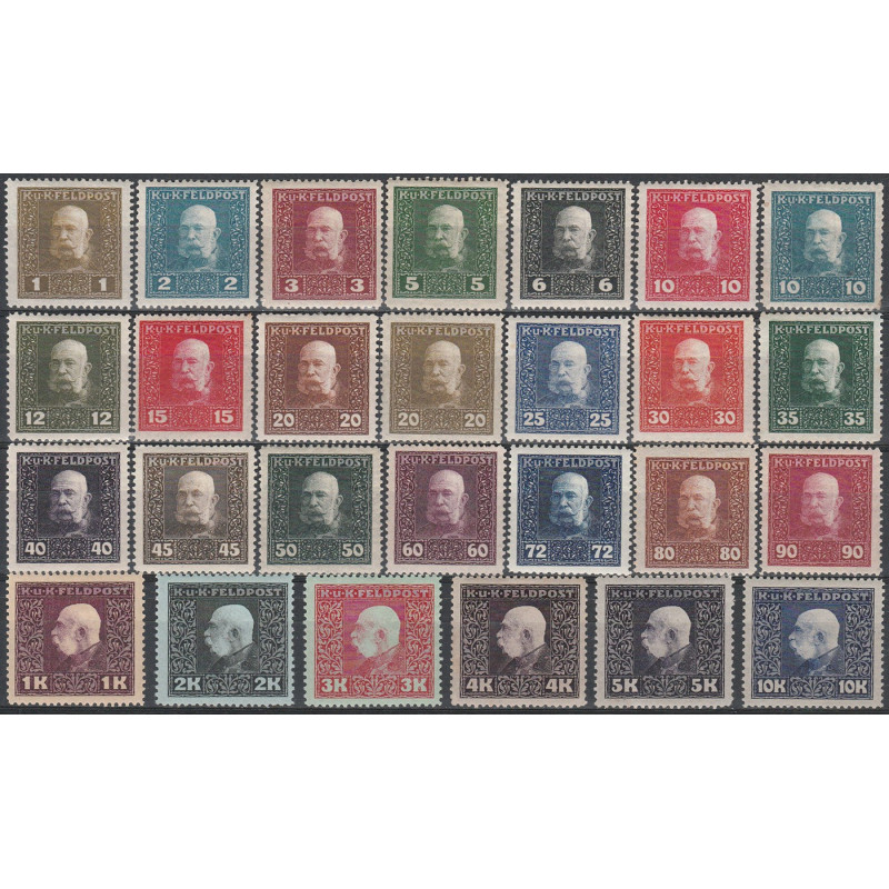 Znaczki obiegowe okupacyjnej poczty austriackiej z podobizną cesarza Franciszka Józefa. Znaczki czyste bez lub z minimalnym śladem po podlepce.