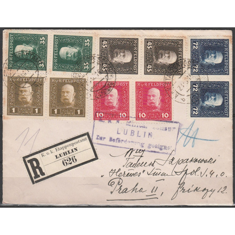 Okupacja austriacko-węgierska. List polecony z Lublina do Pragi. Użyte znaczki wojskowe z podobizną cesarza Franciszka, Mi 22, 27, 35, 37 oraz 40.
