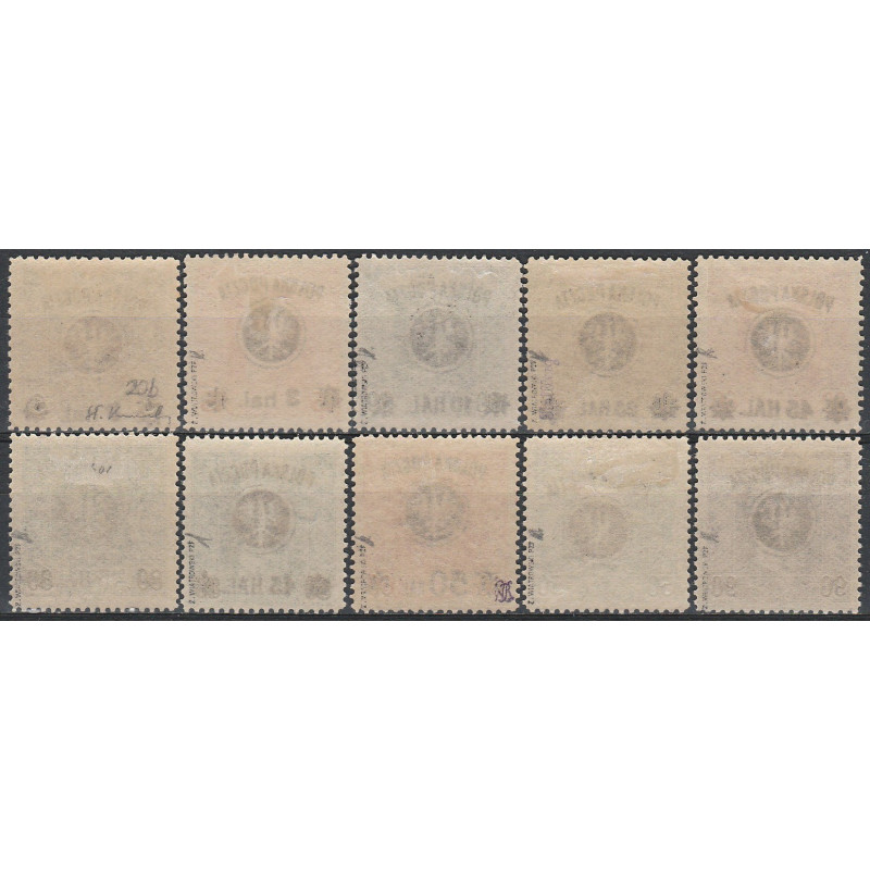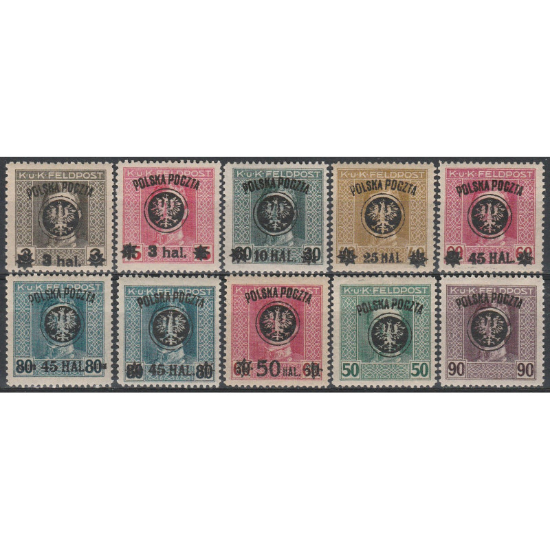 Wydanie przedrukowane na znaczkach austro-węgierskiej poczty polowej. Znaczki czyste ze śladem po podlepce, część znaczków bez podlepki, w tym znaczek 25b. Gwarancja.