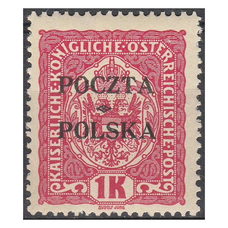 Wydanie przedrukowane na znaczkach austriackich. Znaczek czysty ze znikomym śladem po podlepce. Gwarancja Z. Wiatrowski.