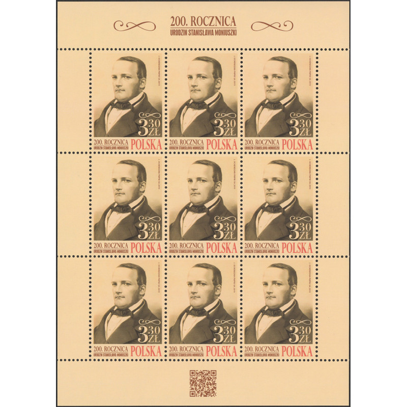 200. rocznica urodzin Stanisława Moniuszki. Arkusz czysty bez podlepki.