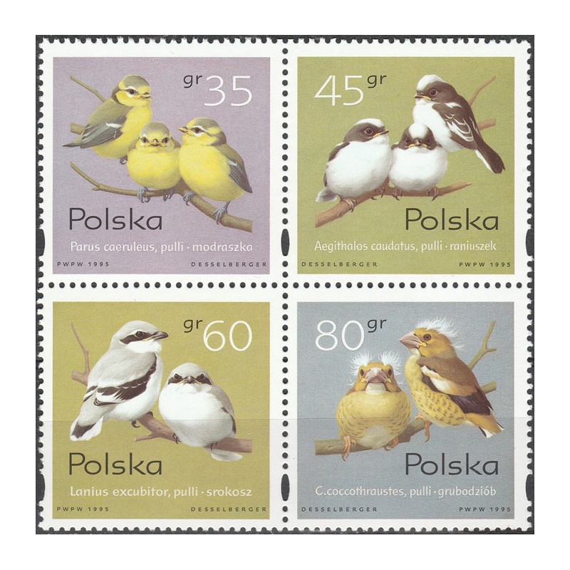 Pisklęta ptaków śpiewających. Znaczki czyste bez podlepki.